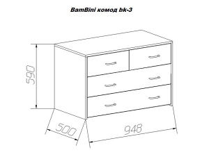 Комод Бамбини BК-3 – Уютная модульная детская мебель для детской комнаты и подростковой спальни. Комод состоит из 4-х ящиков, установленных на шариковых направляющих, обеспечивающих плавное выдвижение ящиков.