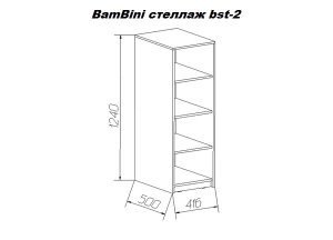 Стеллаж Бамбини Bst-2 – Стильная детская мебель в комнату для детей от 2-3 лет и спальню для подростка. Стеллаж включает в себя четыре полки для хранения различных предметов. Данная модель выполнена из европейского экологически чистого ЛДСП толщиной 16 мм, лицевые кромки покрыты ПВХ толщиной 2 мм. Стеллаж перемещается на колесных опорах.