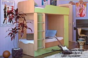 Габариные размеры:Д2052хВ1805хГл1010мм(с учетом лестницы). Спальное место верхней кровати 800х2000мм,нижней кровати 800х1600мм.Уникальной особенностью является возможность увеличения спального места нижнего яруса простым выдвижением торцевого ящика и установкой дополнительного мягкого элемента(можно разложить до 800х1870мм). Матрацы в комплект мебели не входят. Кровать универсальная,расположение шкафа и лестницы взаимозаменяемо.В шкафу размещены три полки и штанга. Цвет:бук/салатовый,бук/жёлтый, бук/синий.
