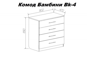 Комод Бамбини Bk4 – Удобный и многофункциональный предмет мебели детской комнаты. Комод состоит из 4-х ящиков, установленных на роликовых направляющих, обеспечивающих полное выдвижение ящиков.