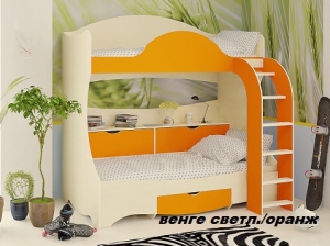 В комплект входит угловой шкаф с полками и штангой,для платья и белья, стеллаж с выдвижными ящиками и полками, кровать на втором ярусе с бортиками, компьютерный/рабочий письменный стол.Безопасность для детей обеспечивает отсутствие острых углов. Ступени лестницы выполненные из массива сосны. В шкафу находится штанга для одежды и 4 полки.