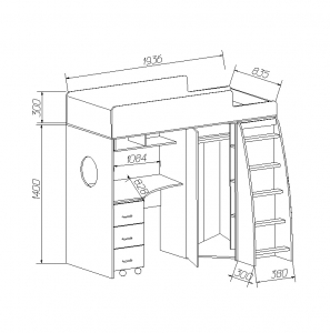 Комплект универсальный, расположение шкафа и стола меняется при сборке. Удобство и безопасность в использовании комплекта обеспечивает отсутствие острых углов и выполненные из массива сосны ступени лестницы.