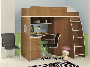 В комплект входит угловой шкаф с полками и штангой,для платья и белья, стеллаж с выдвижными ящиками и полками, кровать на втором ярусе с бортиками, компьютерный/рабочий письменный стол.Комплекс универсальный, расположение шкафа ,стеллажа и стола меняется при сборке.