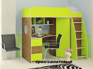 В комплект входит угловой шкаф с полками и штангой,для платья и белья, стеллаж с выдвижными ящиками и полками, кровать на втором ярусе с бортиками, компьютерный/рабочий письменный стол.Комплекс универсальный, расположение шкафа ,стеллажа и стола меняется при сборке.