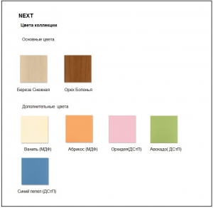 Коллекция Next выполнена из высококачественных современных материалов,экологически чистых и безопасных для здоровья человека. Широкий спектр элементов коллекции ,разнообразие модельного ряда,а также возможность различных цветовых комбинаций позволяют создавать интерьеры для детских и молодежных комнат.