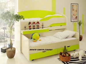 Основная кровать имеет ортопедическое основание, выполненное из фанеры и гнутоклееных ламелей. Выкатная кровать перемещается с помощью колесных опор со стопором.