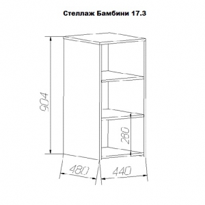 Стеллаж Бамбини 17.3 – Стеллаж с открытыми полками в детскую комнату для ребенка от 1-3 лет и подростков. Cтеллаж включает в себя три вместительных отделений для хранения различных предметов. Данная модель выполнена из европейского экологически чистого ЛДСП толщиной 16 мм, кромки покрыты ПВХ толщиной 0,4 мм.